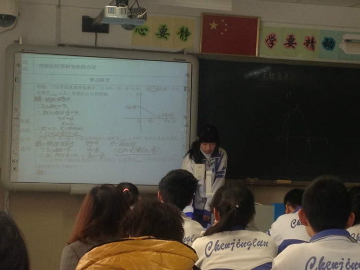两节初三复习课,分别是二次函数复习课中的《等面积变形应用》和《坐标的确定》。首先,两节课的内容都是“经验课程”,是在二次函数基础知识学完后对某一类方法的深入研究与学习,它们都由一个基本的题型总结出一个基本的方法,在保持基本方法不变的情况下进行变式练习,在条件的变换与难度的提高中训练“技能”——学校将该类课定义为技能训练课。其次,在课堂的教学组织上基本相同,都是学生练习,学生展示,学生评价,教师点评归纳,老师说的话都比较少,但对问题的总结很精辟,大多数时间都是学生的练习与展示讲解,这符合我们目前所追求的课堂。其三,从两节课来看“经验”非常深刻,例如第一节课对三角形面积的计算就作了很全面的概括与总结,很有水平与深度。再如第二节课老师在总结求点坐标的方法时归纳出两种思路,一是“线段长(关系)——点坐标(表示)——解析式(代入)——方程(求点坐标)”,二是“解析式(坐标关系)——点坐标(表示)——线段长度(代入关系)——方程(求点坐标)”这样的分析与归纳很值得我们在教学中借鉴。其四,是学生“很会讲”,在课堂教学中很默契,这说明平常的课堂训练很到位,或者说这样的教学方式师生都很默契。