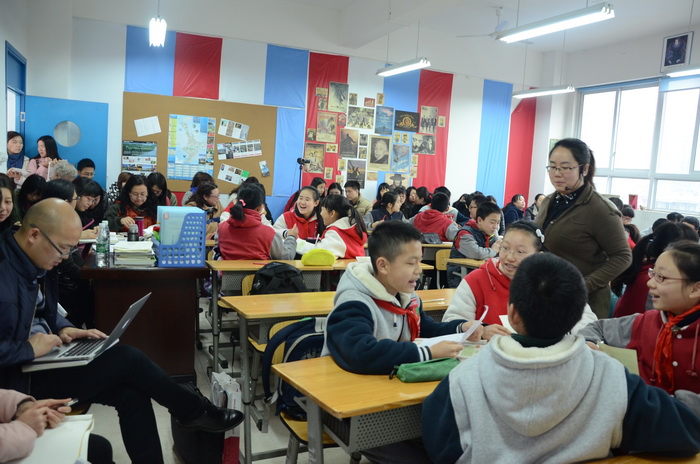 学生在老师的引导和鼓励下,联系生活实际,自由的表达自己的观点和看法,进一步了解自己和他人,享受了学习的过程,建立了学习的自信心。刘老师也给学生们的语言尝试提供了很大的空间,培养他们语境下自然反应和应用的语感。不局限于文本,合理超越了文本。学生在一种安全,愉悦的学习氛围中运用英语。学生演唱英文歌曲,现场主持和调动招聘社员,有趣生动的角色扮演。这些有效的英语活动背后可以看到老师和学生十分和谐的师生关系。