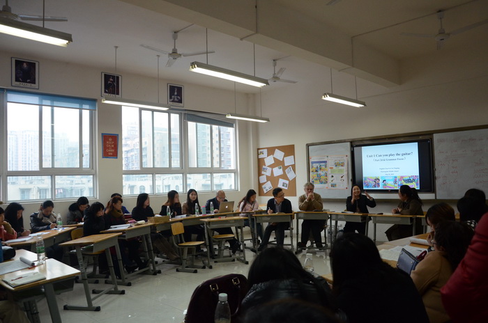 2015年3月10日,泡桐树中学邀请到了来自英国领事馆文化教育处英语项目学术总监Mr. Nick Lidwell. 英领馆文化教育处英语项目高级官员 Mr. Li Rui. 英领馆文化教育处项目官员 Mr. Wu Tong. 区教研员王玉梅、青羊区骨干教师,参与了我校第一届英语节教师沙龙活动,就情景中的语法教学探索与我校教师及区内英语教学骨干交流。并同时开启我校“一师一优课,一课一名师”的活动。