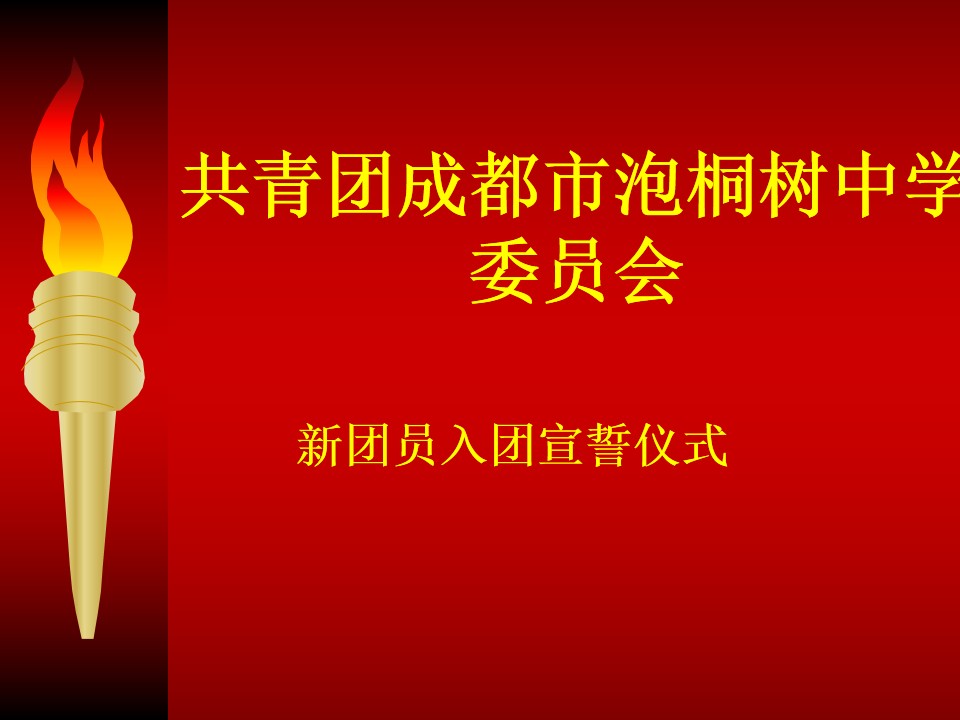团委书记容老师说:亲爱的新团员们,共青团成都市泡桐树中学欢迎你们。现在已经佩戴在每位团员胸前的团徽,是一个代表共青团的徽章,它不是一个普通的装饰品,也不是一般的纪念章,而是共青团员肩负重任的标志。共青团给团员颁发团徽,是对每位团员的信任,也给团员提出了要求,我们相信并要求每个团员,努力学习,积极向上,充分发挥团员模范带头作用。我们每个团员从佩戴上团的徽章的这一刻起,就要认清自己肩负的责任,努力履行团员的义务,用实际行动来表明自己无愧于共青团员这个光荣的称号。
