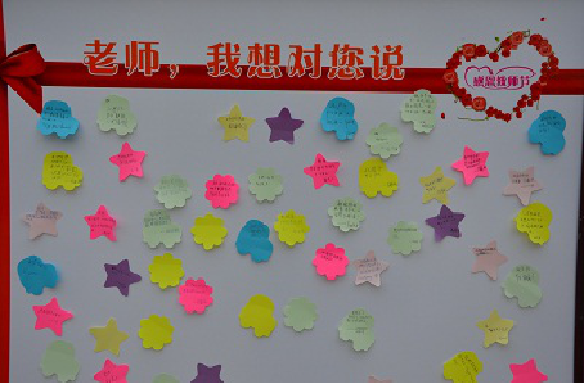9月10日早上,校园内迎面展示的是4块由同学们为老师们设计的温馨俏皮的展板,同时,同学们还在留言板上为亲爱的老师们写下自己的声声祝福,表达了同学们对老师们的深情祝福。