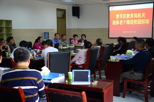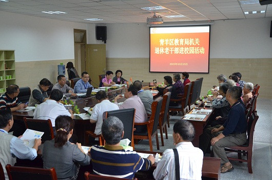 10月15日,青羊区教育局机关退休老干部莅临泡桐树中学参观、指导工作。青羊区教育局副局长王健、干部人事科科长邵开泽陪同参观、座谈。