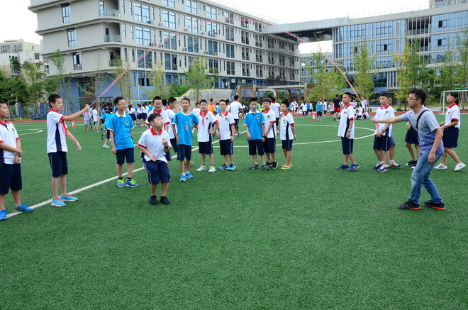 2016年8月27日上午,出伏后的第一天,告别了湿热难耐的“秋老虎”天气,迎来了凉爽的秋风,泡桐树中学2019学部第三天新生入学教育——户外拓展活动在泡中田径场进行。上午8点30分,20个导师班在体育老师的带领下整齐迅速地在操场集合。李霞霏主任对学生前两天的入学教育工作做了总结,并鼓励大家团结协作,赛出风格、赛出导师班精神,积极参与完成体育组精心设计的体育互动比赛。