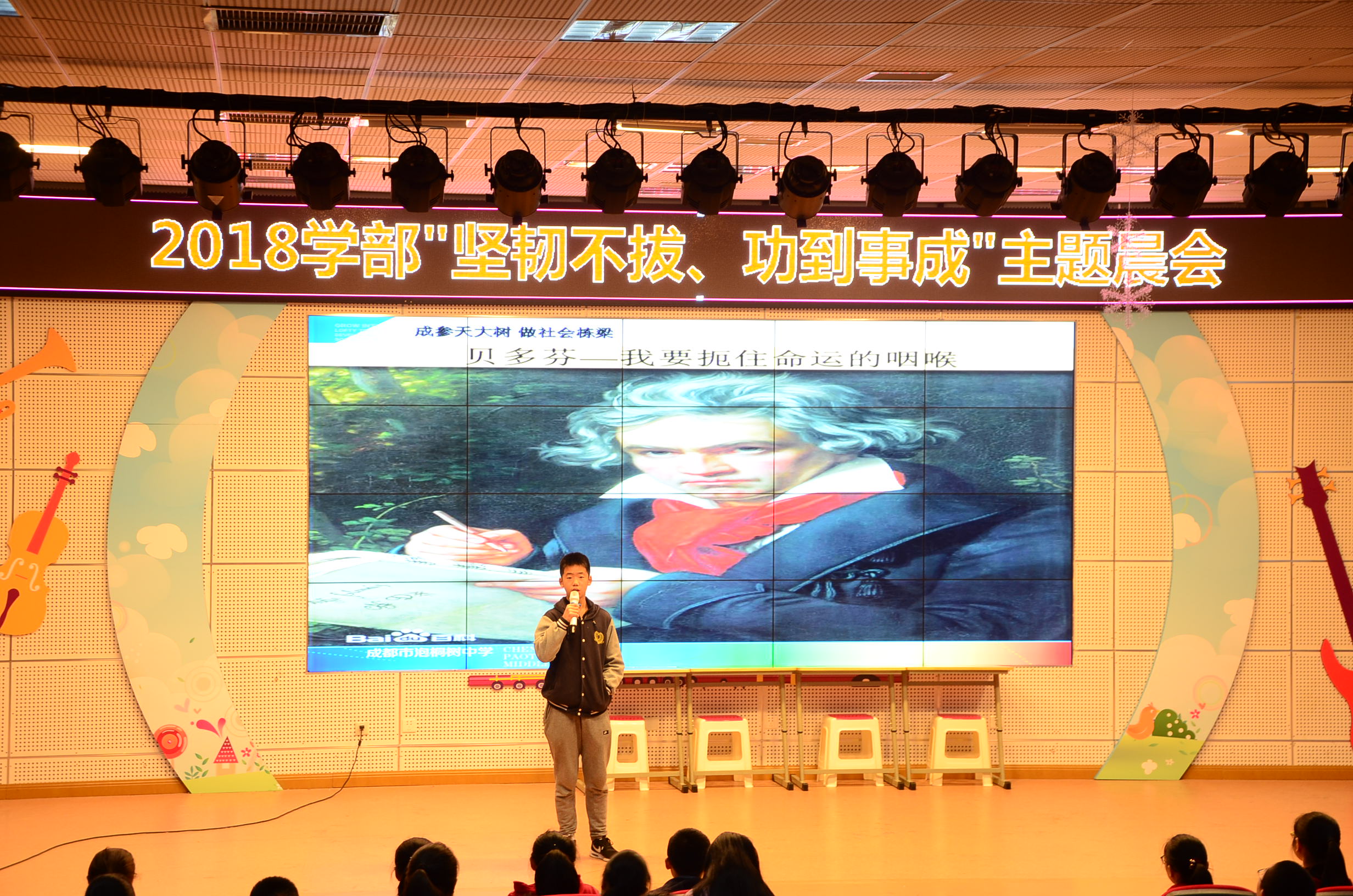 首先,导师五班的同学为大家介绍了贝多芬的事迹,这个伟大的音乐家在26岁时就发现听力出现问题,但他却扼住命运的喉咙,不断的进行音乐创作。我国残联主席张海迪从小罹患骨髓血管瘤,在多次手术后最终高位截瘫,她在这样的身体状况下,坚持自学,获吉林大学哲学硕士学位,翻译多部作品。从小双目失明的海伦凯勒坚持学习,不断突破自我,成为一名卓越的社会改革家,被推选为世界十大优秀女性。