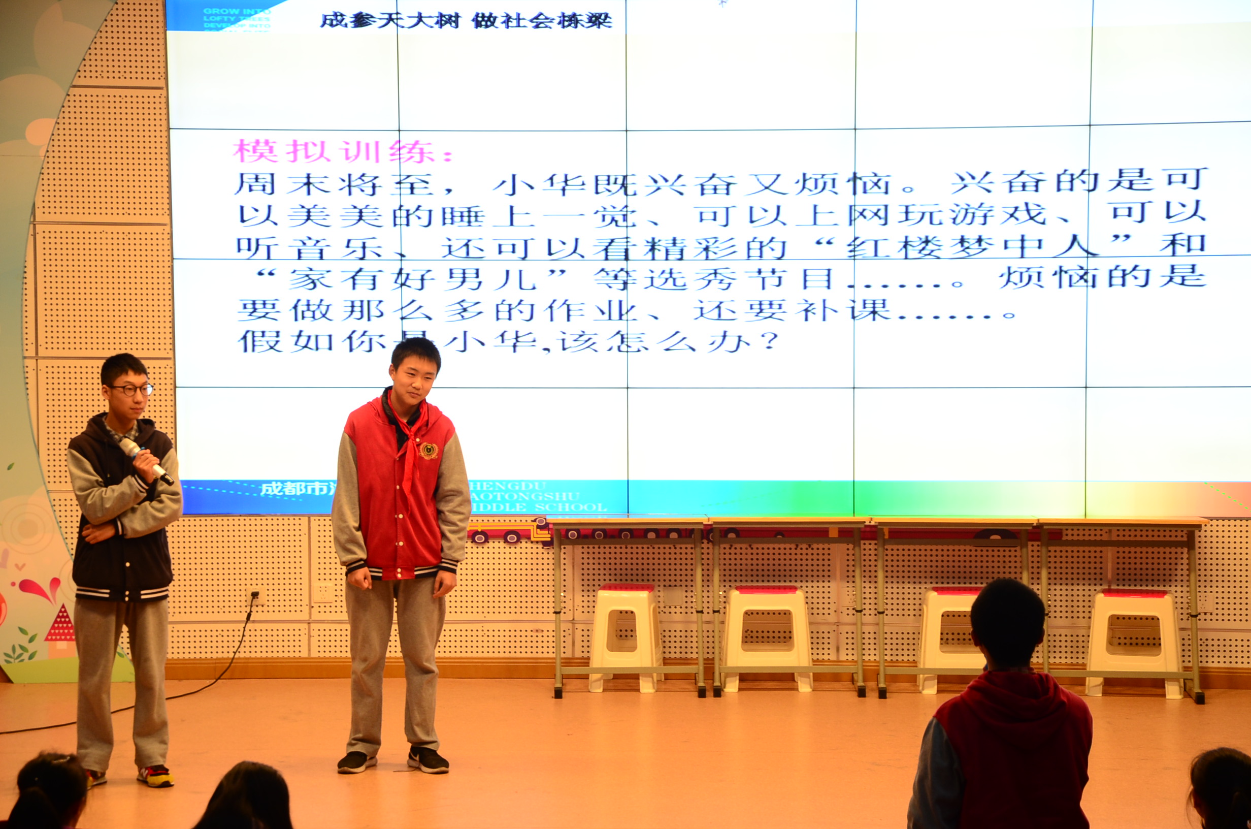 接下来,五班的同学进行了现场模拟训练,在具体的事例中,场下的同学也针对案例提出了建议。