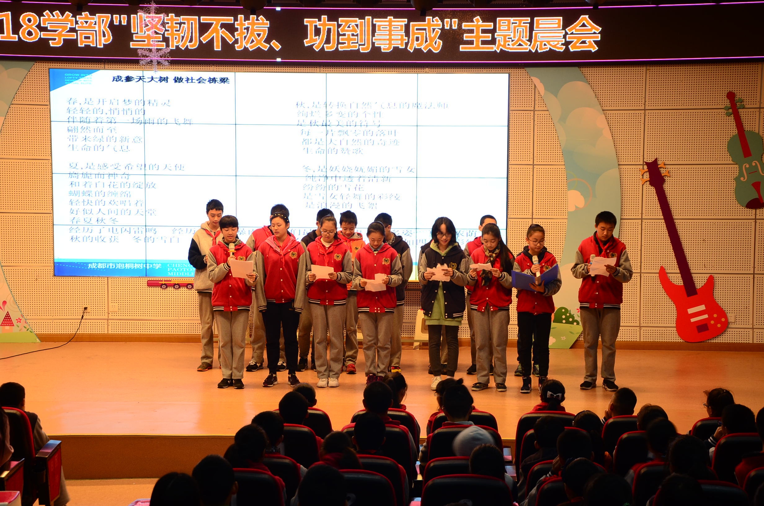 最后,表演的同学一同上场,朗诵了一首优美的诗歌,我们相信,人如果有毅力,也一定会如四季之景一样五彩缤纷。
