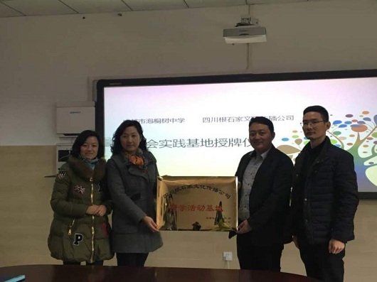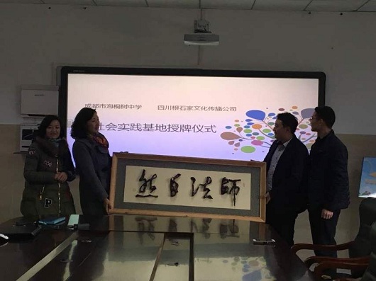 为了弘扬中国传统文化,让学生能够更好的了解传统根书文化。2016年11月30日下午,成都市泡桐树中学与中国根书艺术馆开展了研学社会实践基地挂牌仪式。泡桐树中学欧燕副校长、成长联合会李霞霏主任以及中国根书艺术馆馆长、根书传承人杨卓先生共同出席了仪式。双方表示,在以后学生的研学旅程中将长期展开友好的合作关系。