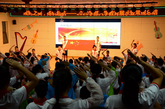 首先是国旗队的学生踏着雄壮的国歌,迈着整齐的步伐,捧着鲜艳的国旗,进行了一次别开生面又肃穆庄严的升旗仪式。