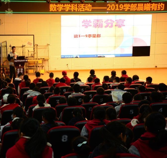 2017年11月27日到2017年12月4日,2019学部开展了丰富多彩的数学活动,本次活动的主题是“走近数学,挑战数学,享受数学”。活动的宗旨是希望同学们通过丰富多彩的活动,生动有趣的数学故事,体会数学的乐趣,感悟数学的魅力,架起数学学习与数学活动的桥梁,提升同学们学习数学的热情,提高数学素养,营造良好的学习氛围。