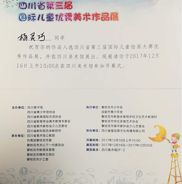 我校2018级杨灵巧同学的画作入选四川省第三届国际儿童绘画大赛优秀作品展,并于12月16日到20日在四川省美术展览馆展出。据悉,这次展览由四川省美术馆、四川省青少年宫协会、四川省教育国际交流协会等机构主办。