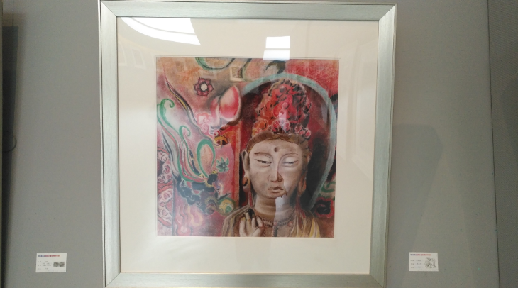 杨灵巧同学的画作《梦回敦煌》巧妙运用色粉作画,用色粉笔直接铺陈上色后,再用纸晕染边界,画面右侧的佛像为着力突出的主题,左侧是飞天图,边角加上了敦煌壁画的常用花纹,展现出敦煌文化的历史感和宗教感,佛像流露出的肃穆的神色,又利用朱砂与深红的融变体现了立体感与陈旧感。