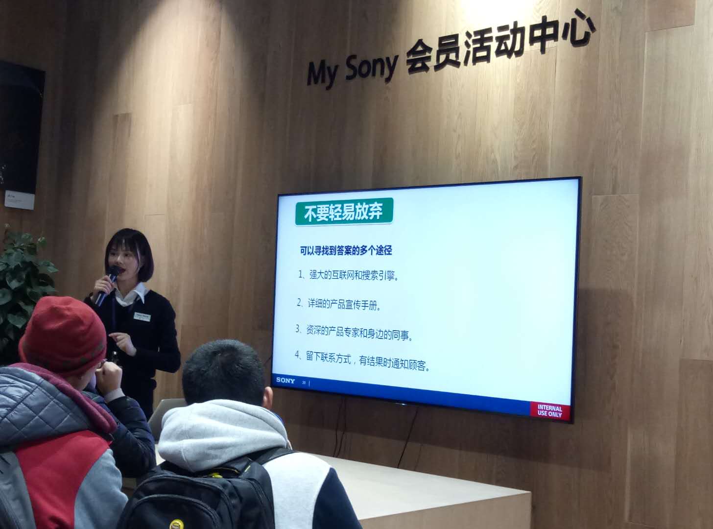 销售经理唐小姐给同学们分享了SONY的品牌文化,简要的发展历程,以及如何成为一名优秀的销售顾问。这时,带队的李霞霏老师抛出一个问题:“你们知道怎样让顾客舒服地买到自己想要的产品吗?”同学们根据自己的经历,纷纷发表自己的观点:1、根据顾客爱好及性能分区域进行有序摆放产品。2、设置舒适的体验区域。3、有舒适的消费环境等。同学们的发言,频频赢得在场老师和同学的掌声。