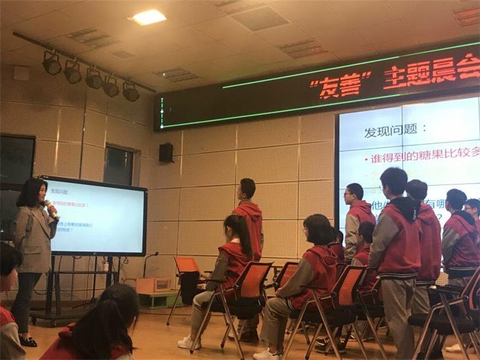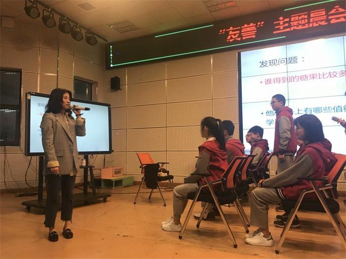 首先,江老师以一个生动有趣的故事引入,告诉同学们友善是大家相互给予的。再让大家参与互相赠送糖果的活动,来发现彼此身上的闪光点。在这过程中,同学们都积极参与并配合老师的指令,现场气氛活跃,活动结束后,江老师邀请同学们发表自己的感想。然后,江老师为大家播放了一则公益短片,让同学们明白友善一定是会得到回报的。最后,不少同学主动分享了自己在校内以及家中力所能及的友善之举。