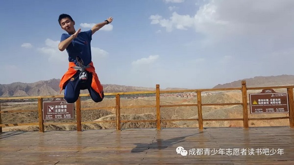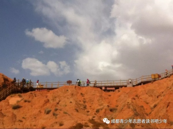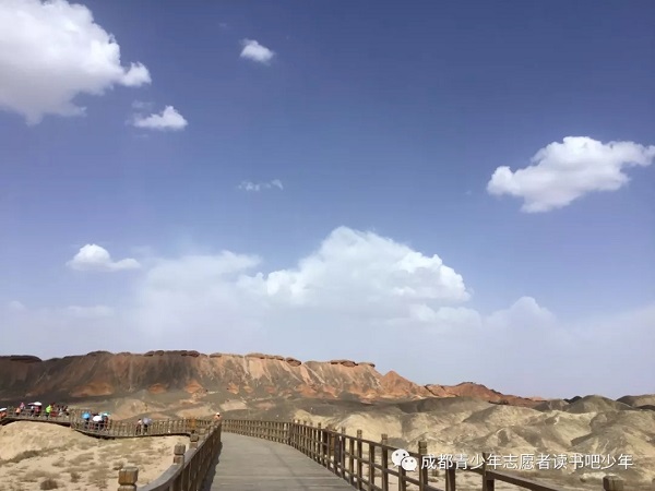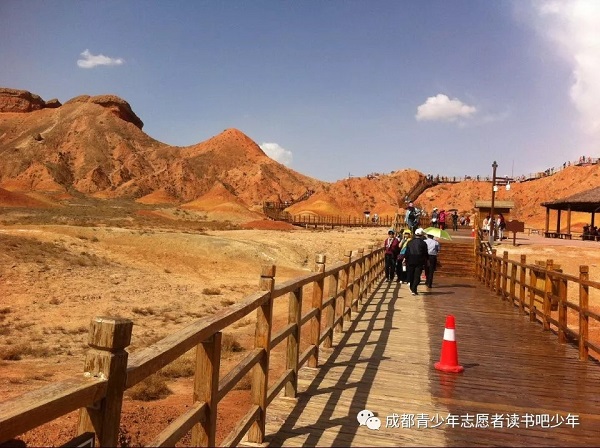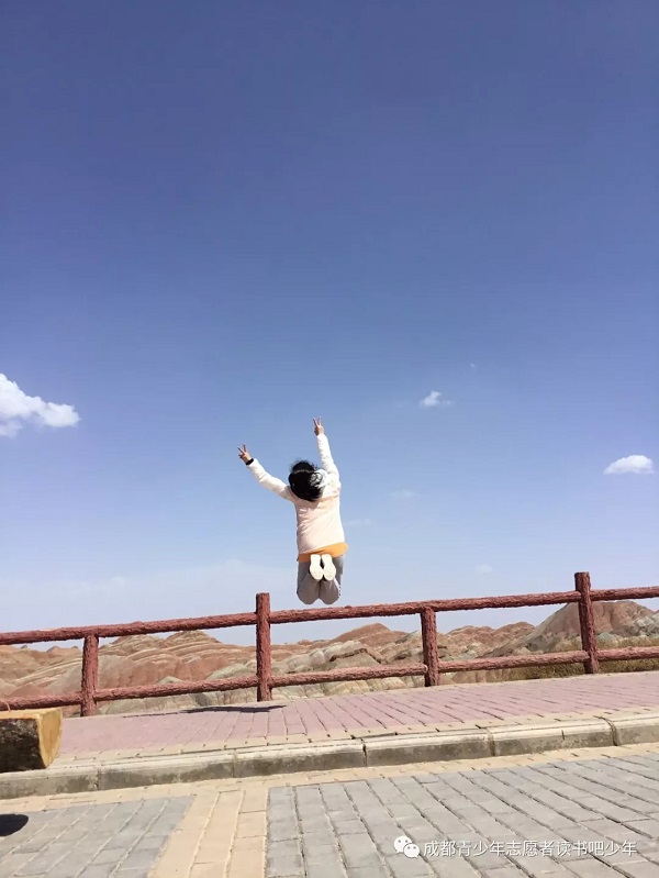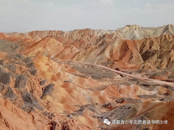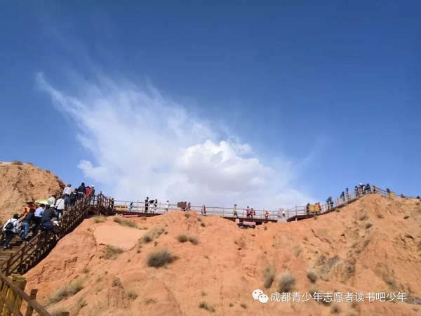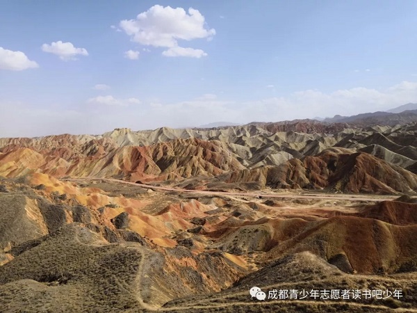 在来这里之前,我一直以为,古代诗人所说的“大漠孤烟直,长河落日圆”以及那“羌笛何须怨杨柳,春风不度玉门关”,只是他们发的小牢骚。但今天见到这壮阔美丽的七彩丹霞时,我整个人都被震撼了,有了与古代诗人一样的体会。同学们也都在这一片丹霞景观中,流连忘返。