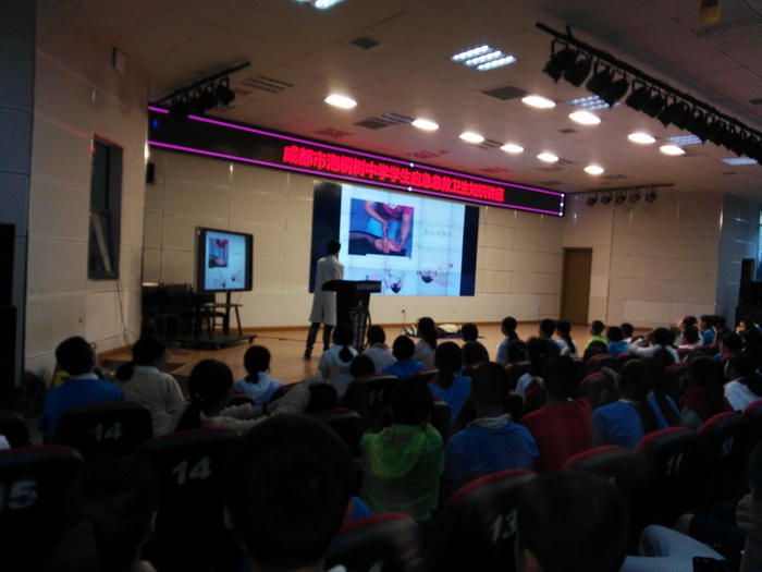 下午5:10,在学校多功能厅,金沙社区卫生服务中心的医生首先介绍心肺复苏的原理和重要性,以通俗易懂的语言表达了学好急救知识的重要性,在场师生认真聆听,仔细体会。然后医生播放了华西医院“心脏复苏”的视频,加深了学生们对“心脏复苏”的理解。