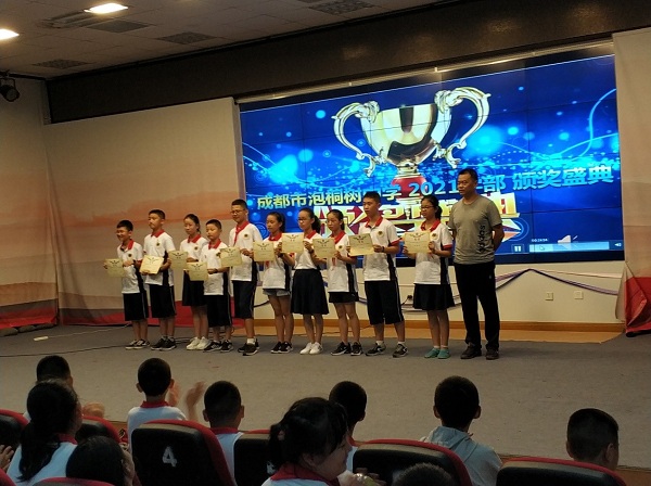 体育学科主任张勇老师,为“同舟共济”游戏活动的获奖班级颁奖