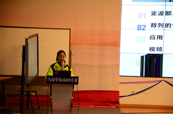 首先,数学教研组长邹伶老师宣布活动正式开始,四位学生代表依次上台向同学们分享他们的数学见闻。第一位上台的戴思宇向同学们介绍了第三次数学危机的产生和解决过程,让同学们感受到数学是一门严谨和趣味共存的学科;紧接着王哲衡同学由毕达哥拉斯的地板问题引出勾股定理的由来,让同学们发现数学问题源自生活,又应用于生活;接下来赖飞越敏同学讲述了神奇的斐波那契数列、叶雨昕同学和大家分享了数学学习的技巧和她的学习经验。过程中台下的同学听得津津有味,仿佛进入了一个有关数学的奇妙殿堂。