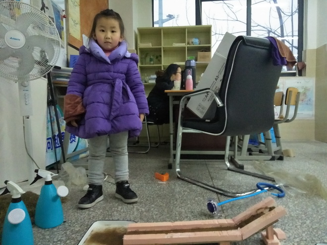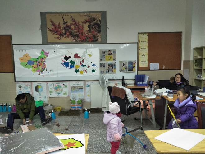 白板上留着与孩子身高相当的稚嫩的画作;地上凌乱地放置着制作教具的各种淘来的废旧材料;一位家属正用刀子、剪刀、自带胶枪……按照王老师的需求设计教具;一位坐在电脑前略显随意打扮的王老师。不禁掏出手机留下这些画面,为王老师为同为教师的自己和千千万万教师感动。为泡中最美家属点赞!为稚嫩的孩子感到心疼!为努力向上的同伴骄傲!