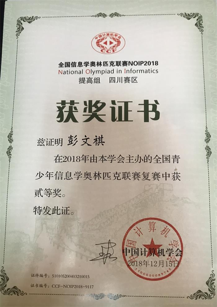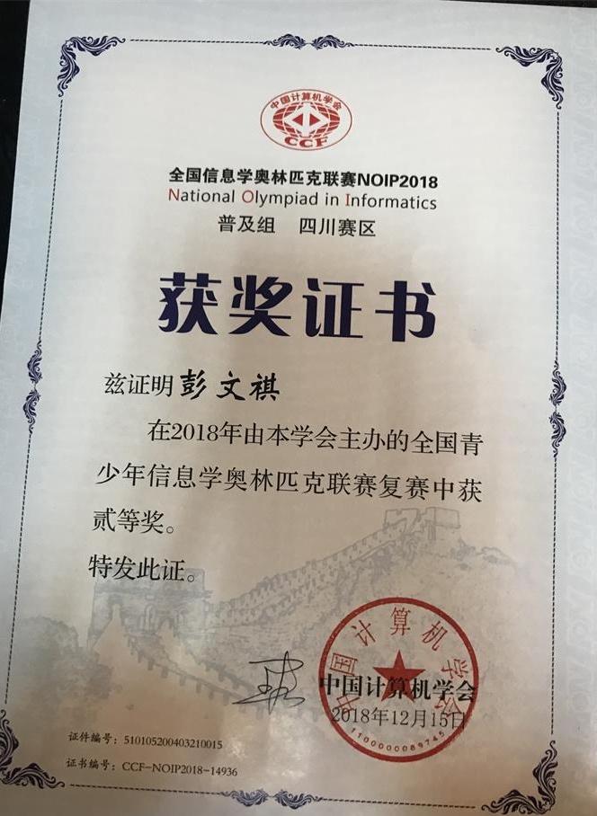 王茹月、彭文祺同学更是其中的佼佼者。王茹月同学在第三十四届成都市青少年科技创新大赛中荣获一等奖!彭文祺同学则在全国青少年信息学奥林匹克联赛中获得普及组和提高组的二等奖,成为泡中骄傲!