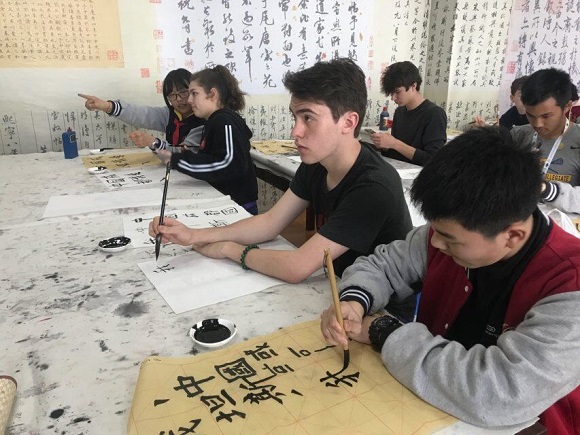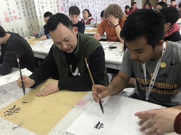 此后,在李勇老师、王文杰老师的热情和专业水准的指导下,我们的美国小伙伴们便开始了他们的中国书法体验。从书法的历史到最基本的用笔,美国孩子们都乐在其中。