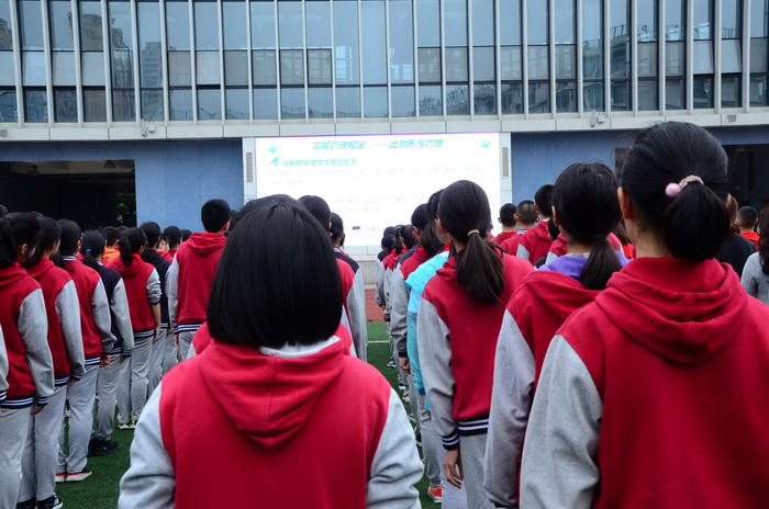 为进一步解决学生发型服饰一系列常规问题,规范学生在校期间的行为规范,落实《中学生日常行为规范》,4月15日上午7:50,在杨校长、欧校长、容主任的带领下,七八年级的全体老师对七、八年级的全体学生的发型服饰问题进行地毯式的检查、拉网式的排查。
