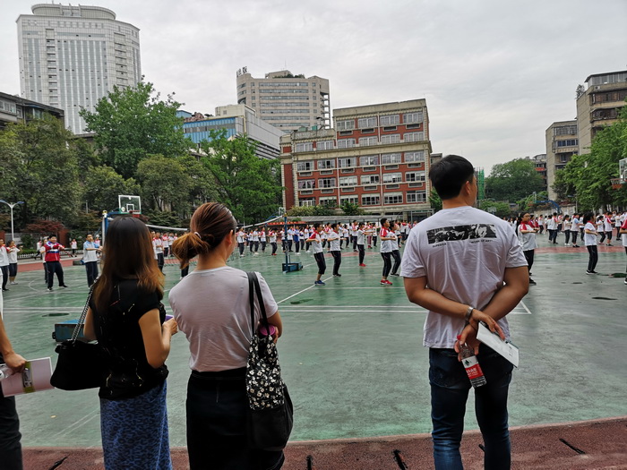 活力四射的音乐响起了,青春飞扬的学生们跑向了操场,开始了整齐划一、气势恢宏的大课间运动,广播体操舒缓了学生的筋骨,班级集队跑吹响了青春的号角,学校自编操落实了体考的要求。泡桐树中学的老师们一边观看,一边和树德的老师讨论着素质教育的落实。