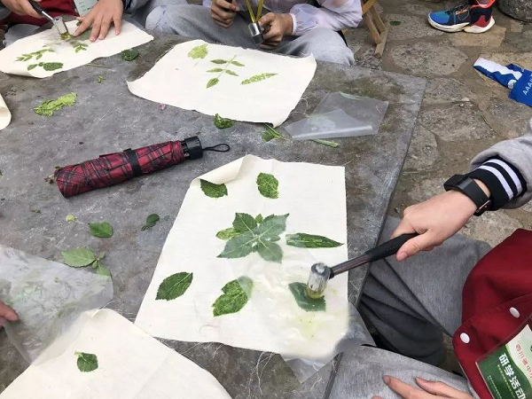 在6000年前半坡人就开始尝试通过将植物的汁液印染在麻布衣上来让衣服变得不再是单调的麻布色。而今天,在史前工场的植物捶染这个项目中,同学们将要体验的就是效仿半坡人把形状奇特的叶子和体态优美的花儿印染在麻布上,变成一幅美丽的作品。同学们自己捶染的麻布还能带回家呢!