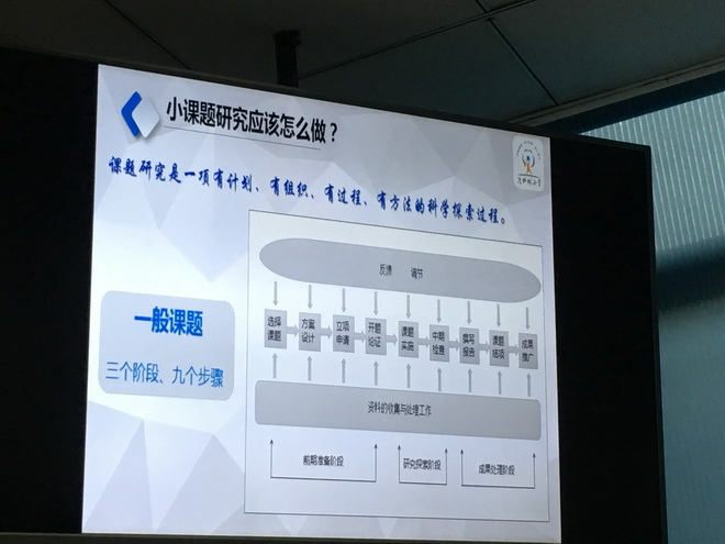 紧接着,陈校长就老师们最关注的问题“小课题研究究竟应该怎么做?”给出了“三阶段九步骤”的回答。“三阶段”分别是指前期准备阶段,研究探索阶段,以及成果处理阶段。前期准备阶段则包括选题、方案设计、立项申请、开题论证。研究探索阶段主要指课题实施和中期检查。成果处理阶段就包括了撰写报告、课题结项和成果推广。