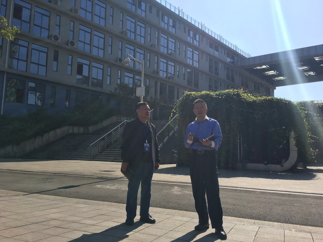 钟督学和赵书记在教学楼检查瓷砖是否有脱落等安全问题
