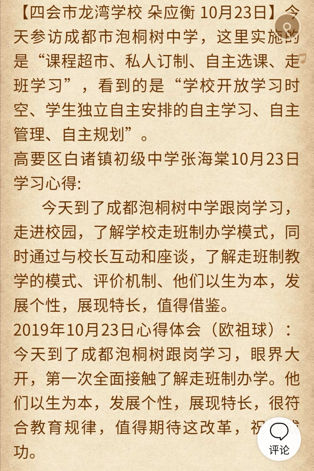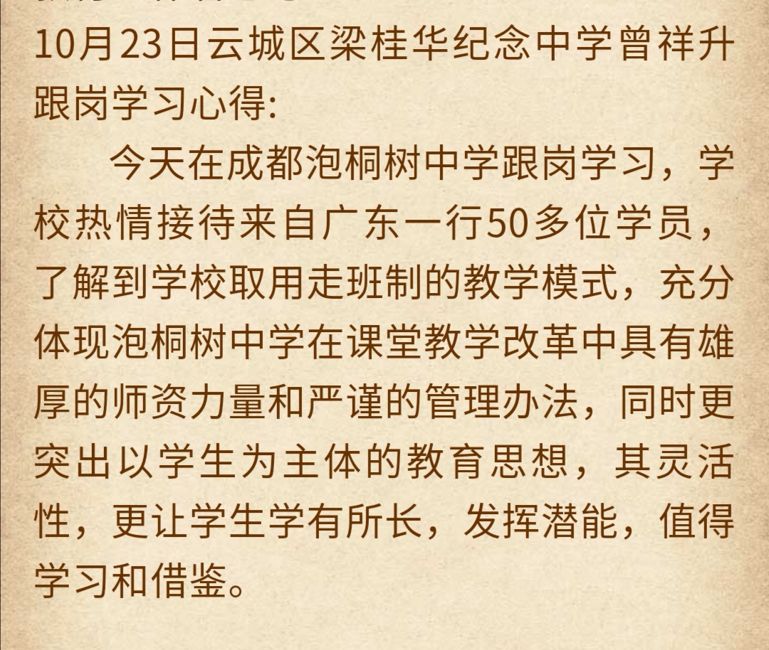 经过短暂的泡中一日交流学习,在初涉泡中的所看所听所思所想,部分骨干教师及同仁对泡中有自己的心得与想法。