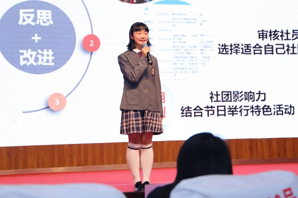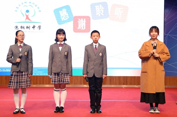 比赛中,何礽杰、戴思宇、雷悦迩三位同学自信大方,淡定从容,分别从社员、社长的角度,向评委老师和现场观众讲述了自己在泡中的社团经历及收获,展示出了泡中学子优良的综合素质!