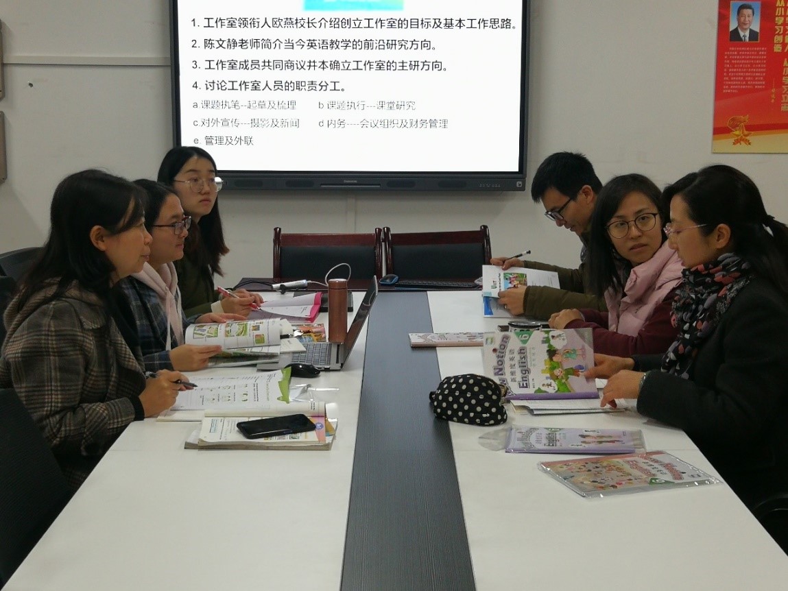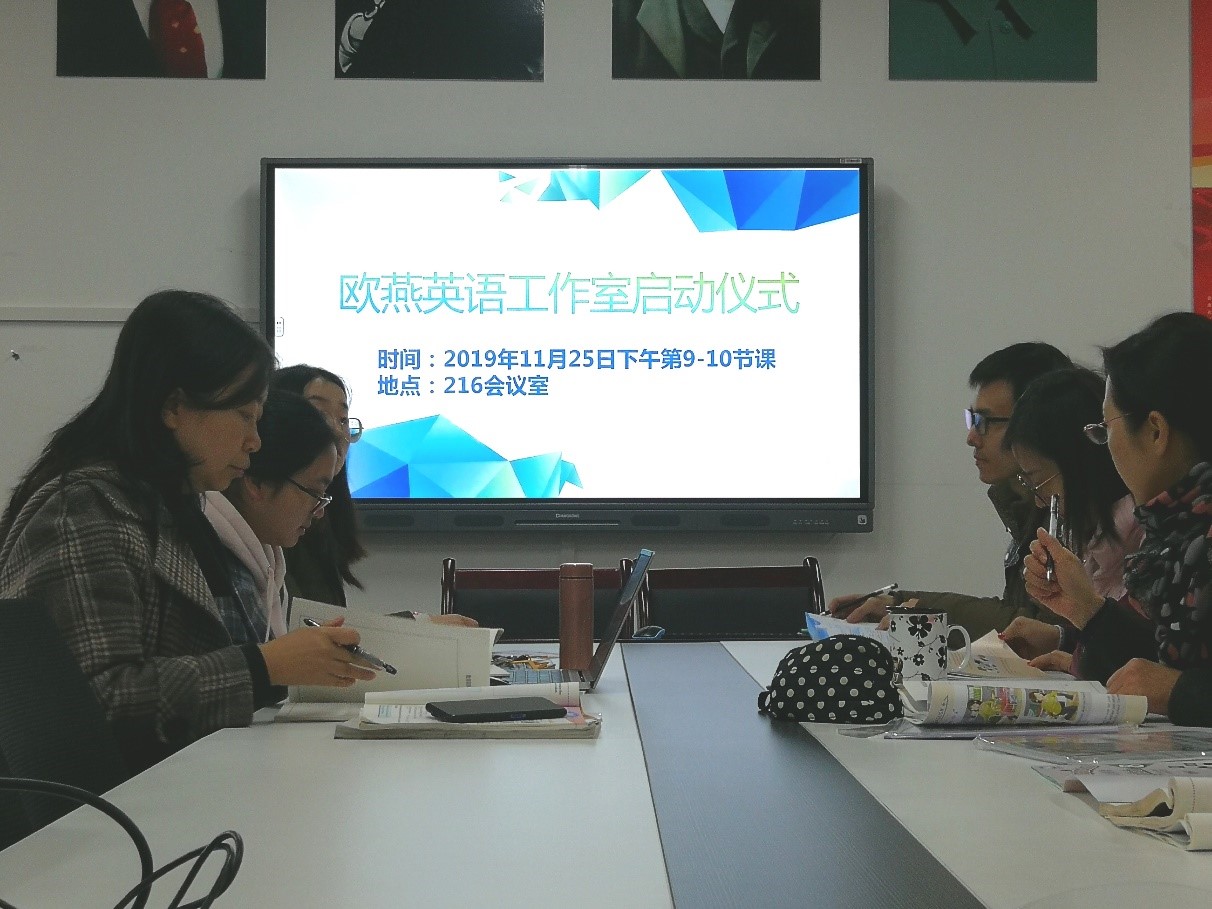 欧燕英语工作室第一次会议于2019年11月25日下午第9-10节课在216会议室举行。工作室的成员有王枢、陈斌、姚尧、陈文静、刘雨洁五位老师。