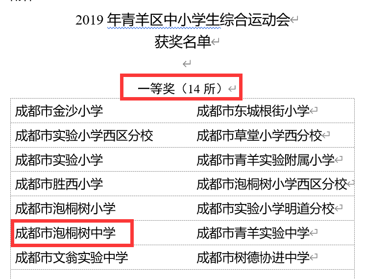 在过去的2019年,泡桐树中学全体师生认真贯彻落实《中共中央国务院关于加强青少年体育增强青少年体质的意见》文件精神,深入推进素质教育,大力开展阳光体育活动,根据2019年青羊区中小学生综合运动会的积分,我校荣获青羊区初中组一等奖第一名。