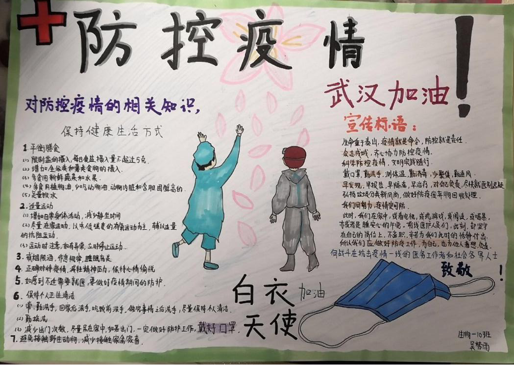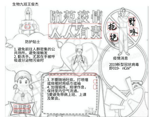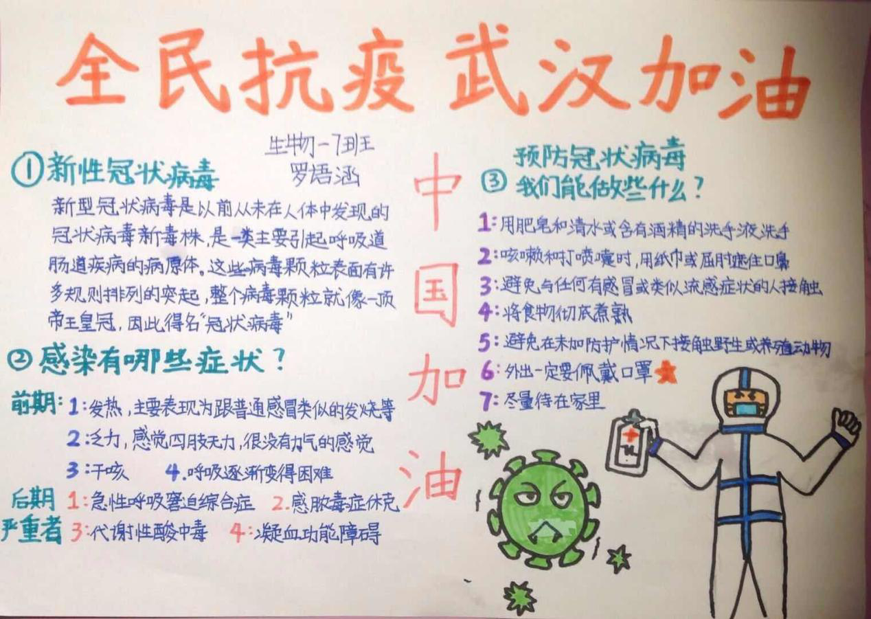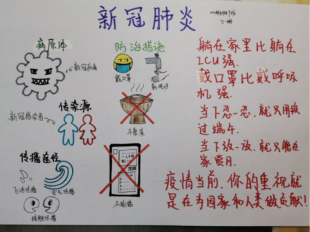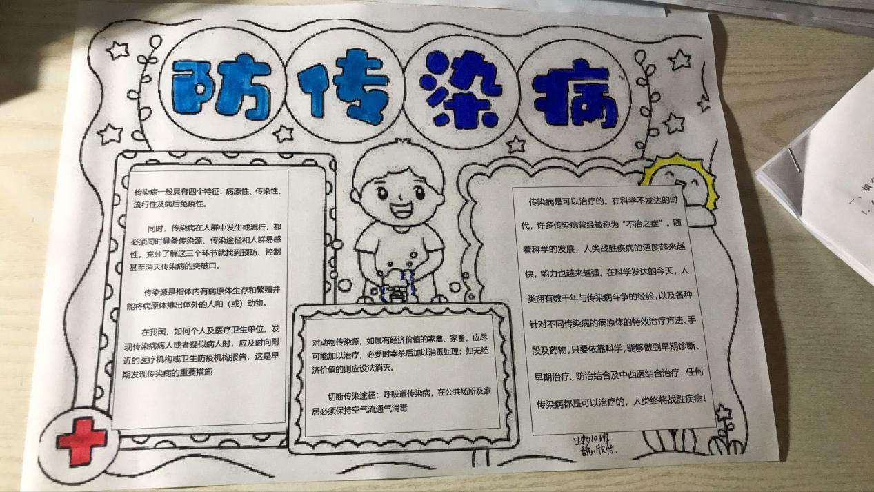 什么是传染病?什么是病原体?本次传播疾病的新型冠状病毒又是何方神圣?此病毒想要侵害人体需要突破哪些人体防卫关卡?在停课不停学期间,泡桐树中学生物组精心准备了以“新冠肺炎传染病”为主题的课程,内容包括:病原体与传染病、人体防控疾病的三道防线、特异性免疫与非特异性免疫等,并以水痘、流感、新型冠状病毒等学生耳熟能详的疾病或病原体为例,使课堂贴近生活并富有吸引力。课程完成后,学生们制作了关于“传染病防控”的宣传小报,在自身学习了传染病相关知识的基础上,结合艺术和创造力宣传防护知识,以下是本校同学们的部分宣传作品: