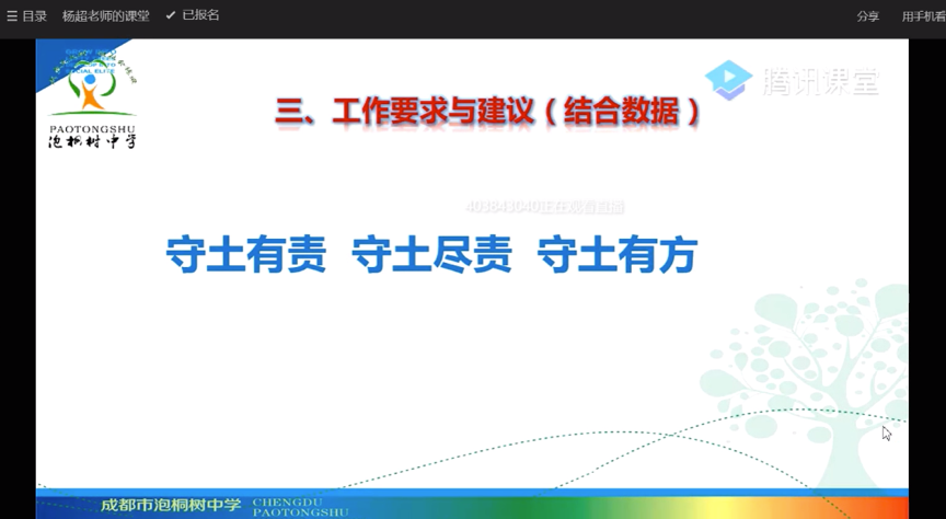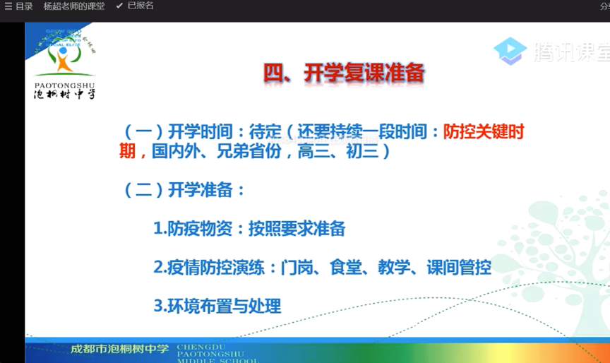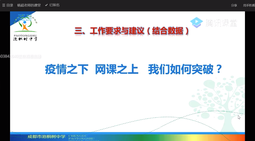 3月13日下午,成都市泡桐树中学组织了线上会议,全校所有教职工参与了此次会议。会议通过QQ签到,腾讯课堂直播的方式开展。校长杨超作为主讲人,向全校教职工传达了疫情特殊时期,学校前期工作反馈,并提出了后期的工作要求。