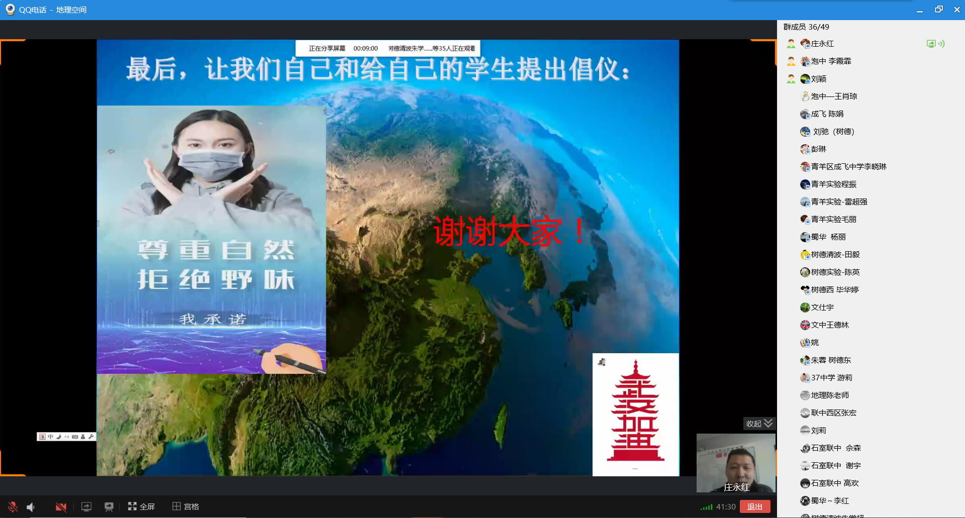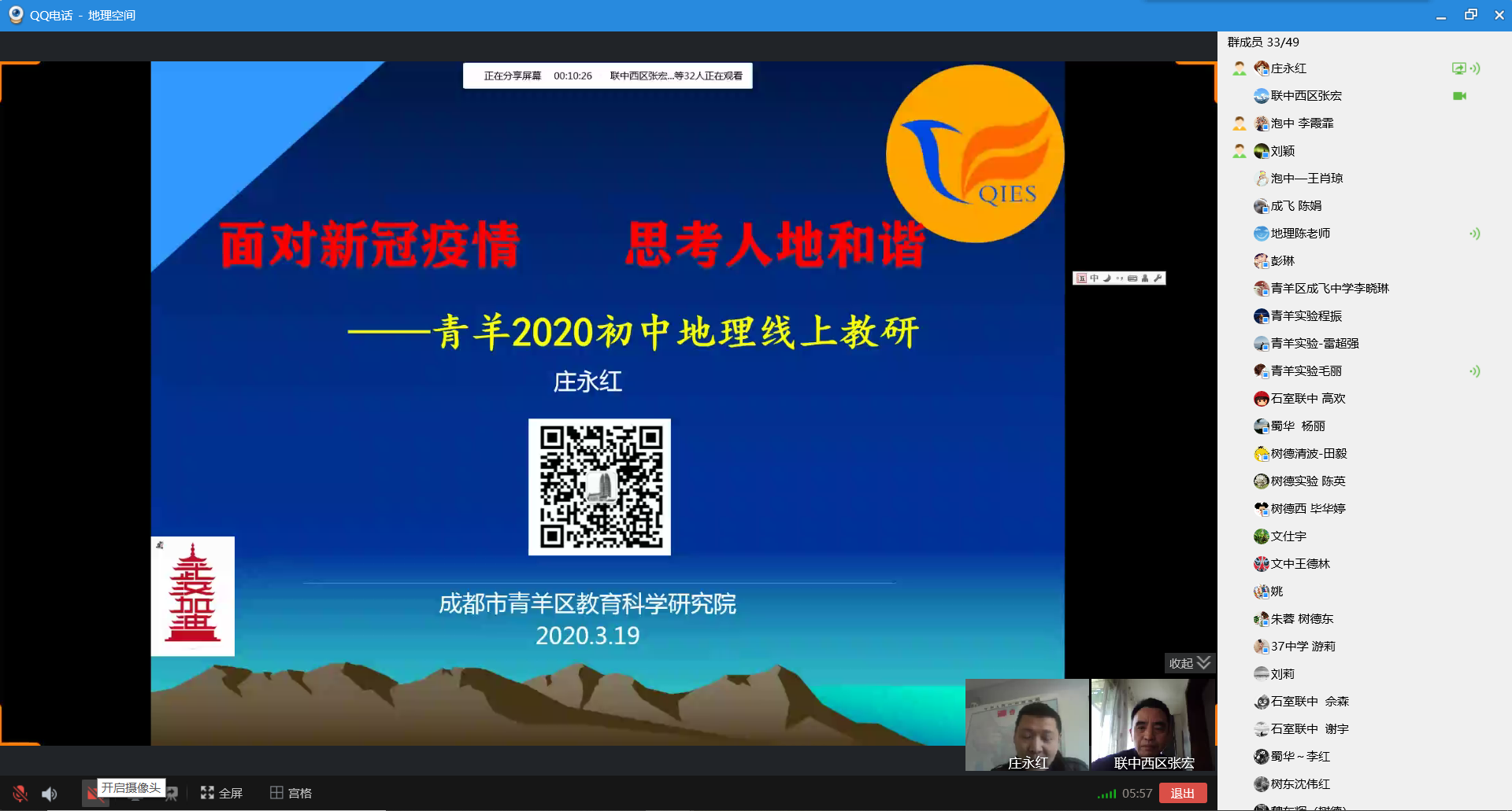 2020年3月19日上午,青羊区全体初中地理老师在区教研员庄老师的组织下,通过QQ群视频直播软件召开了以“面对新冠疫情 思考人地和谐”为主题的研讨会。