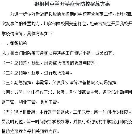 为扎实做好2020年春季开学前的疫情防控工作,保障开学后各项教育教学工作顺利进行,以“坚决阻断疫情进校园、确保师生不被感染”为目标,检验学校错时错峰开学预案的科学性和可操作性,确保师生健康、学校安全。3月20日下午2点,成都市泡桐树中学举行疫情防控模拟开学系列实战演练。