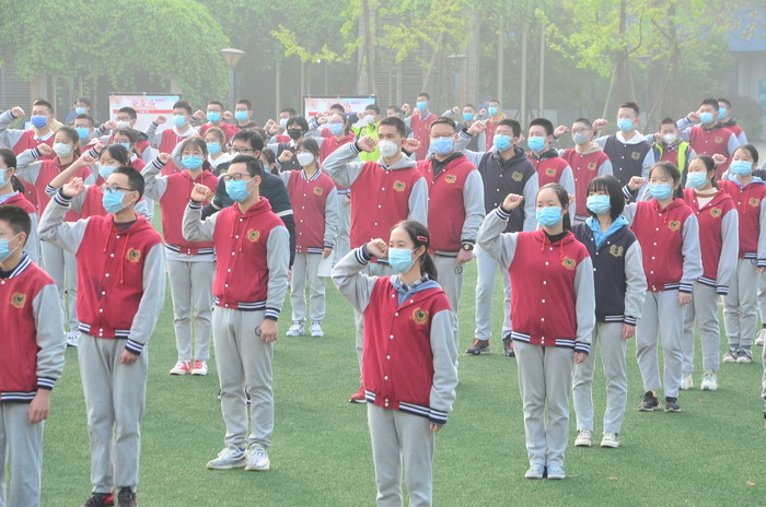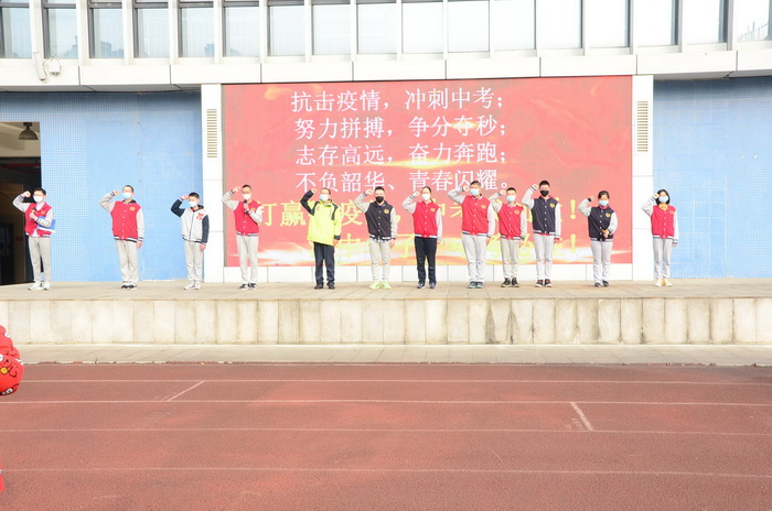 面对疫情,教师要守师德大爱之节,学生也要立民族复兴之志,面对疫情,我们并肩战斗,圆梦六月,我们携手共进,学生代表段翼航等人和全体学生一起喊出“打赢抗疫战,中考我灿烂”的铮铮誓词。