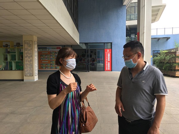 牟佳与督学强调学校在新冠肺炎疫情常态化防控工作中要一手抓教育教学,一手抓疫情防控,在组织保障、人员管控、重点区域、环境卫生,希望学校继续做好安全防疫工作,并对工作中存在的不足之处提出改进建议,确保校园师生在特殊时期的安全。