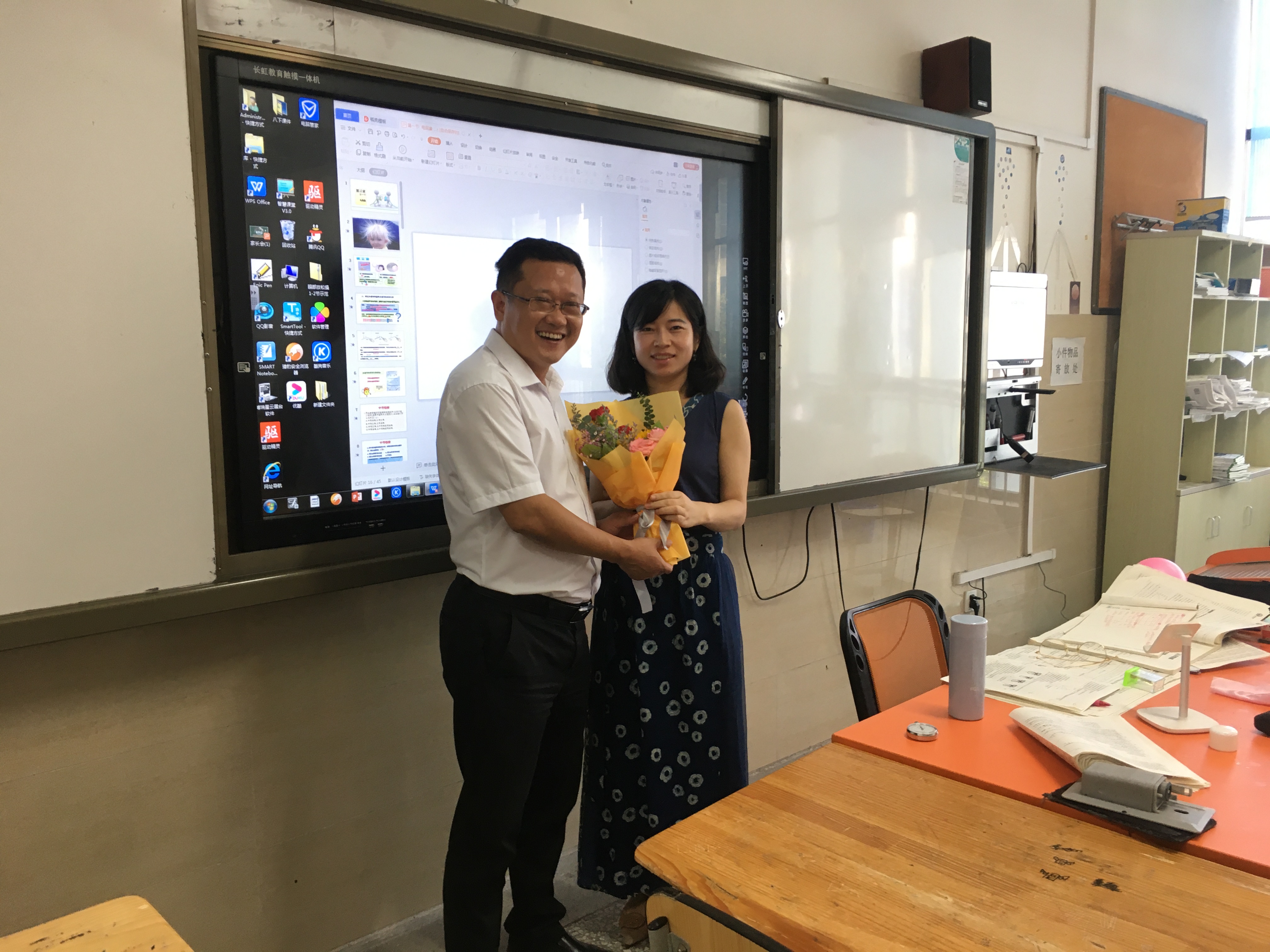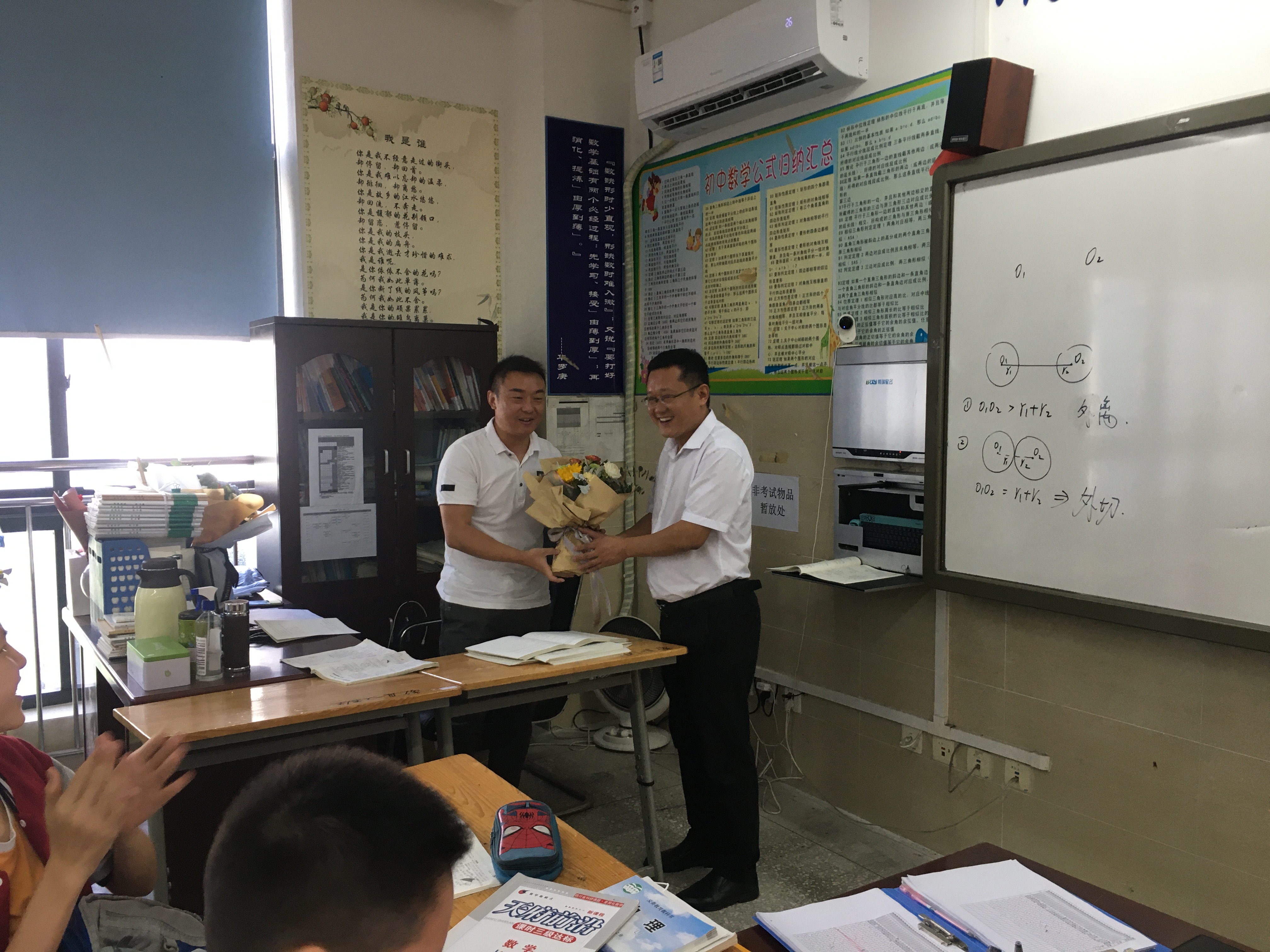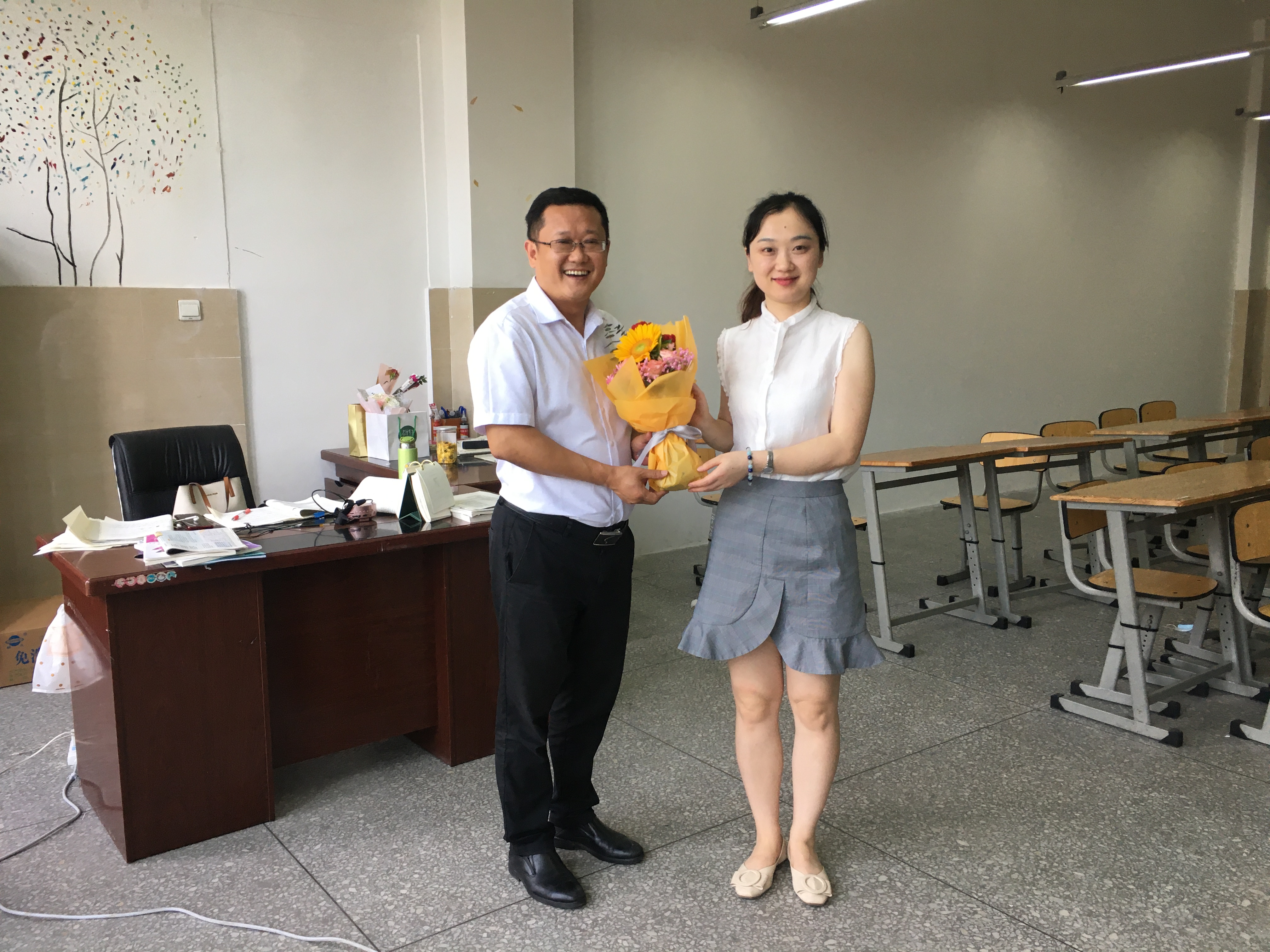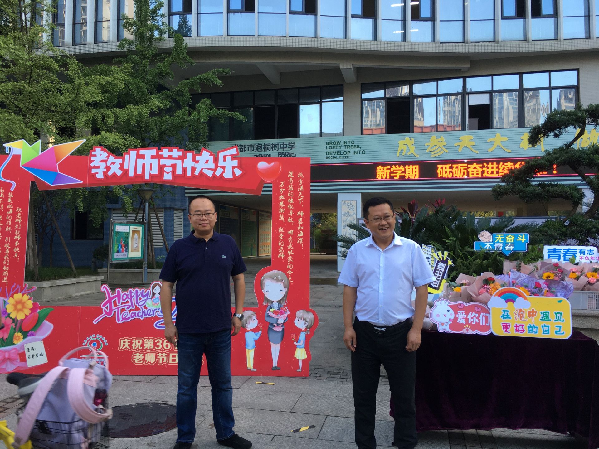 一束束鲜花等待着老师们的到来,和鲜花们一起等待老师们的,还有泡桐树中学的校领导们。