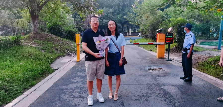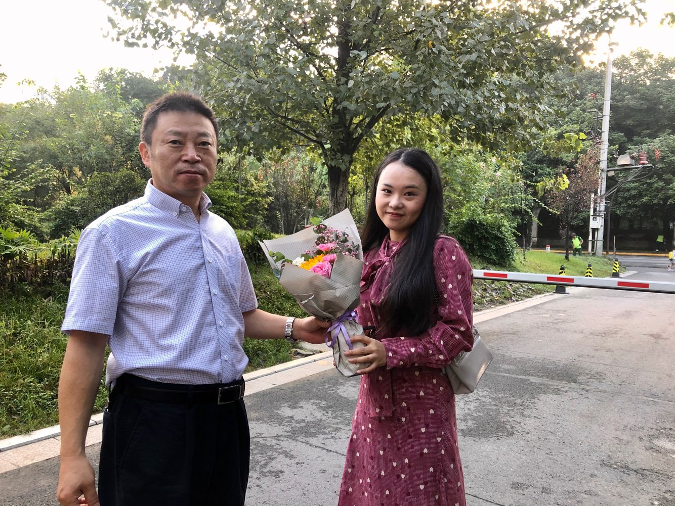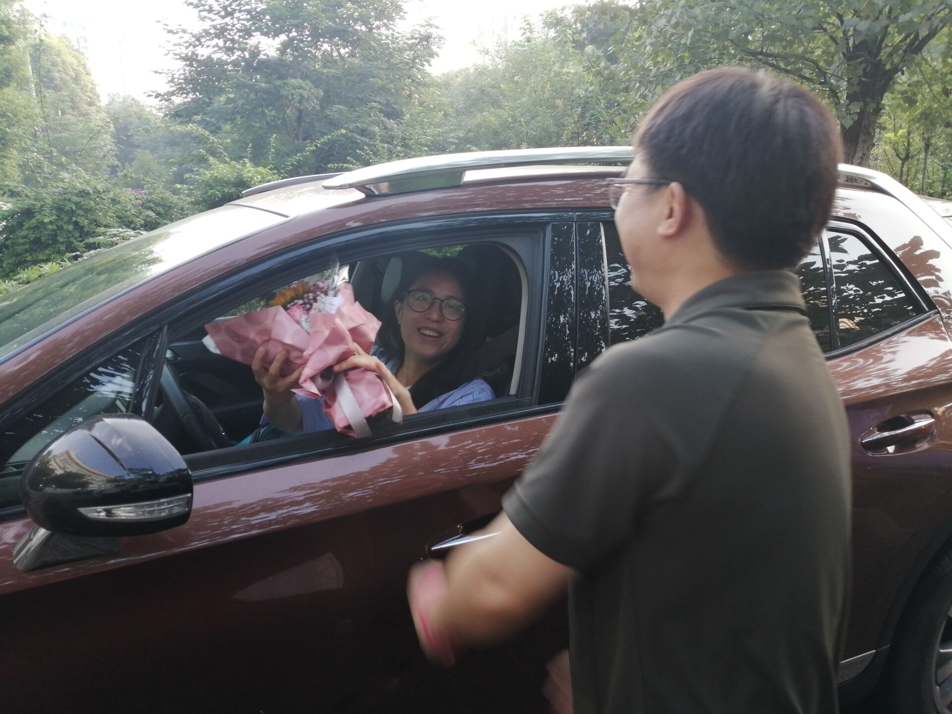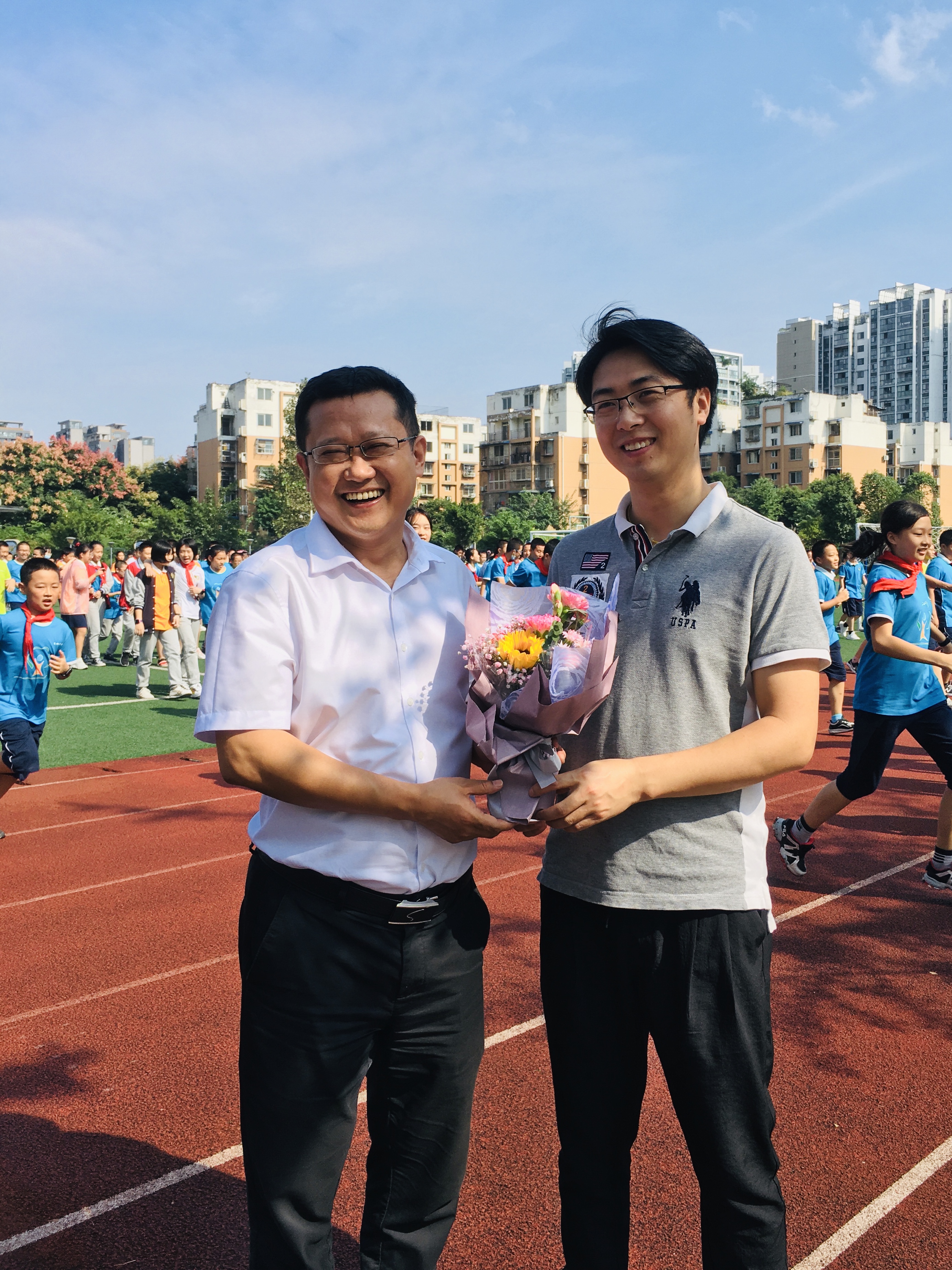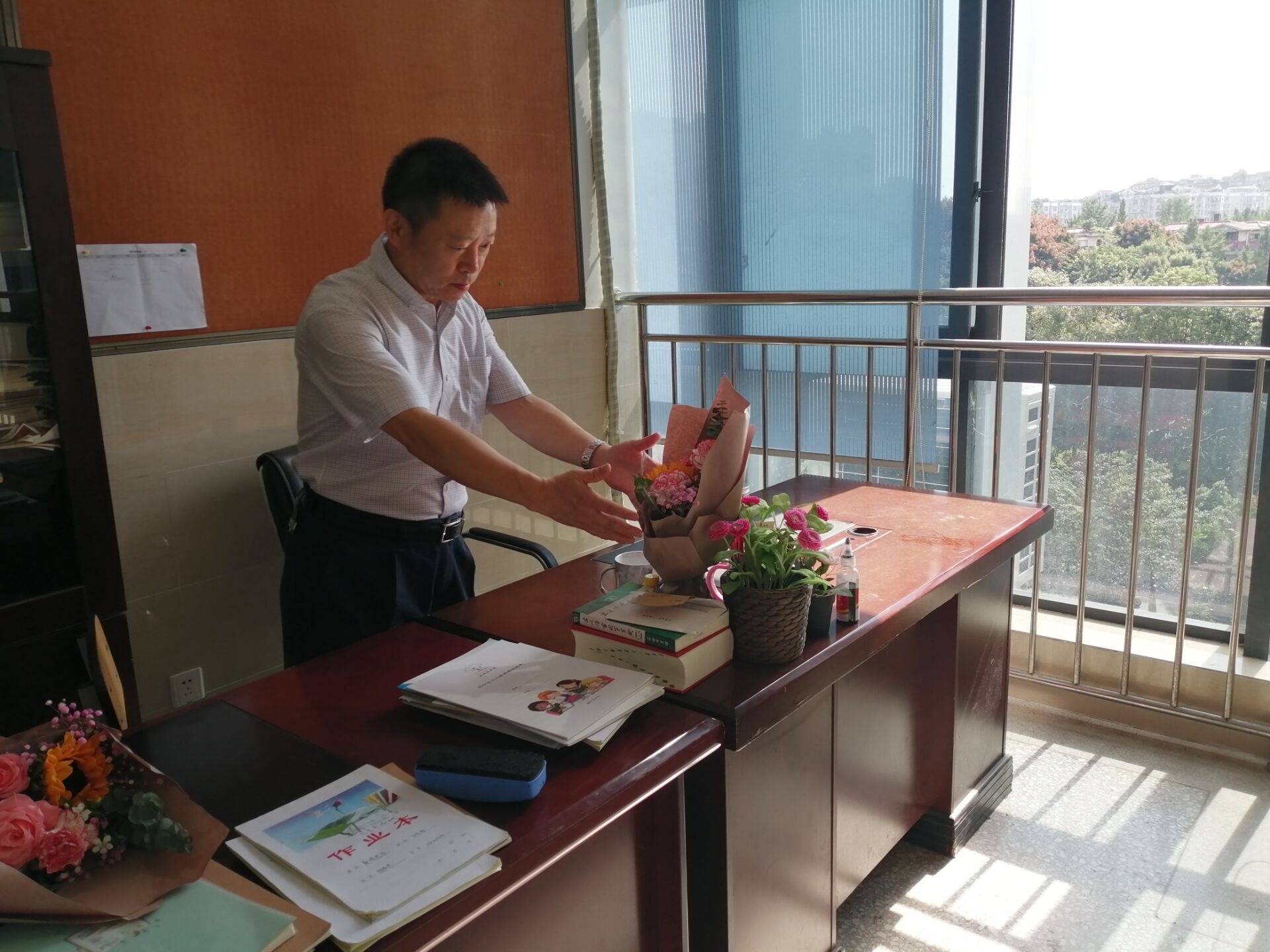从侧门进入学校的老师,也没有被美丽的鲜花“错过”。赵东书记、曾笙主任、陈斌主任、詹李梅主任,将教师节的美丽花束亲手送至老师们的身旁。