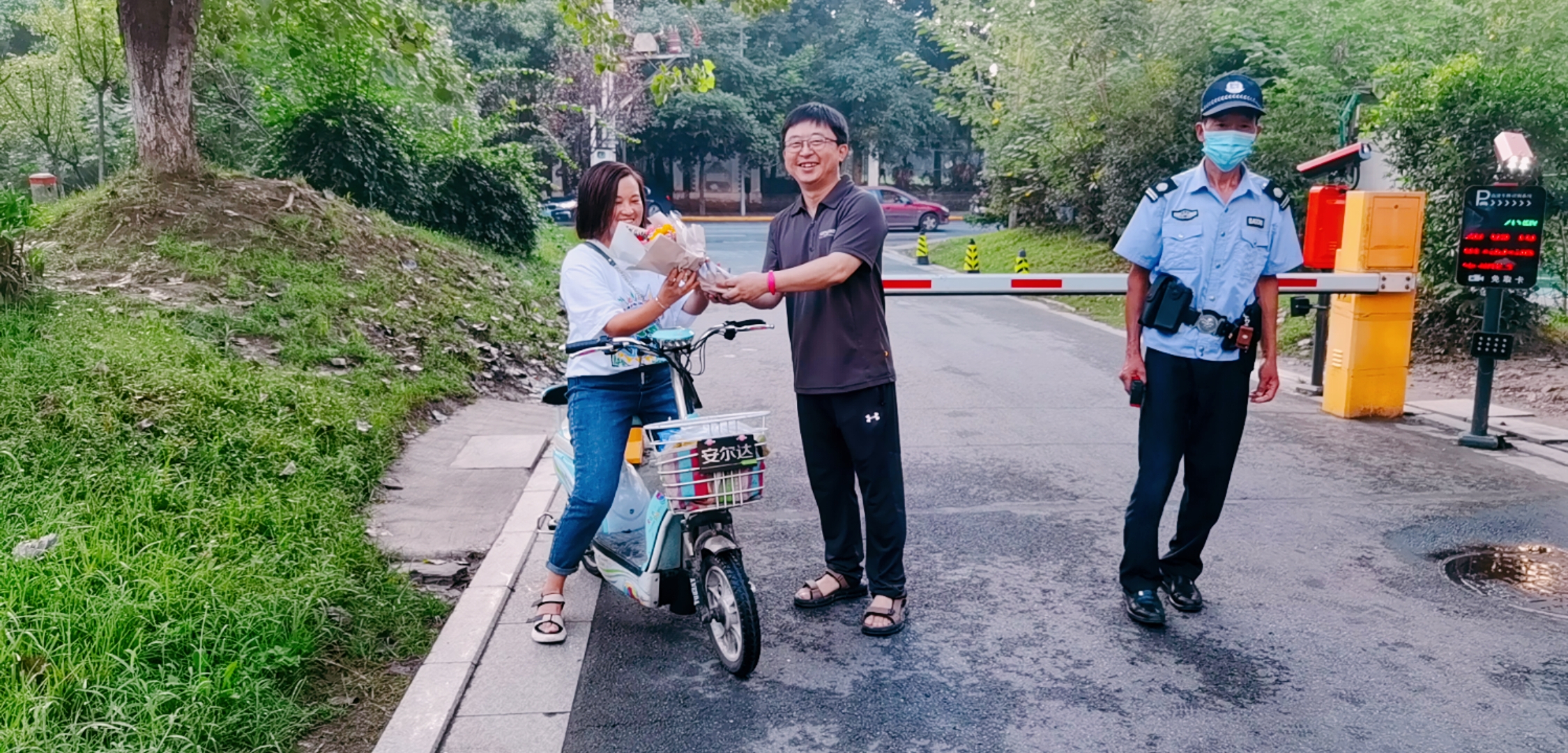 杨超校长、李霞霏主任、王明亮主任、王其明主任,为每位进入学校正门的老师献上美丽的花束。