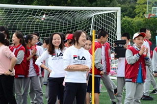 老师们也加入到激烈的接力赛当中,一旁的同学们大声的为老师们加油打“call”。