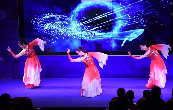 晚会活动在唯美的《大鱼海棠》舞蹈中拉开了序幕,深蓝背景下,三位身着红裙的舞者踢腿、跳跃,仿佛要冲破时空的束缚,传递出向上、热情的意志。