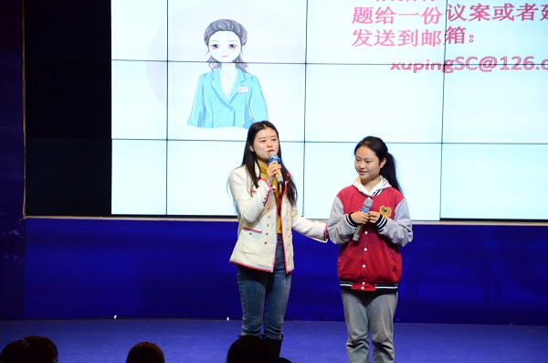 徐萍姐姐首先深入浅出地为我们介绍了什么是“两会”,并且为我们展示了她在18、19和20年分别参加两会时在人民大会堂前拍的照片。照片中,她都身着蓝西装,正当同学们疑惑徐姐姐为什么三年都不换一幅时,徐萍姐姐为大家解释到,她想通过这样一种方式来宣传简朴节约的美德,以此来影响别人,少一些浪费。徐姐姐说:“作为人民的代表,自然是人民的一员,同样不需要养尊处优,能做的就是一心一意为人民服务。”
