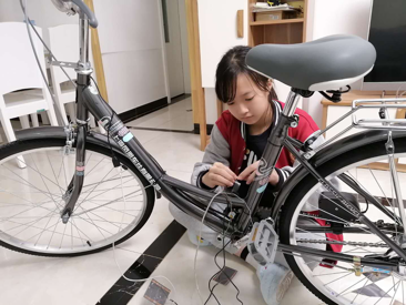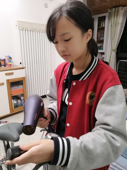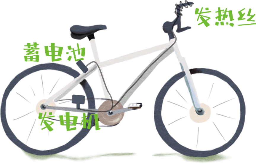 孟柯妤同学从小热爱科学,动手能力强,喜爱发明创造。在某次骑自行车时突然萌发解决冬天骑自行车手部冰冷问题的想法,于是查阅了多种资料,初步形成手部取暖功能的自行车构想。