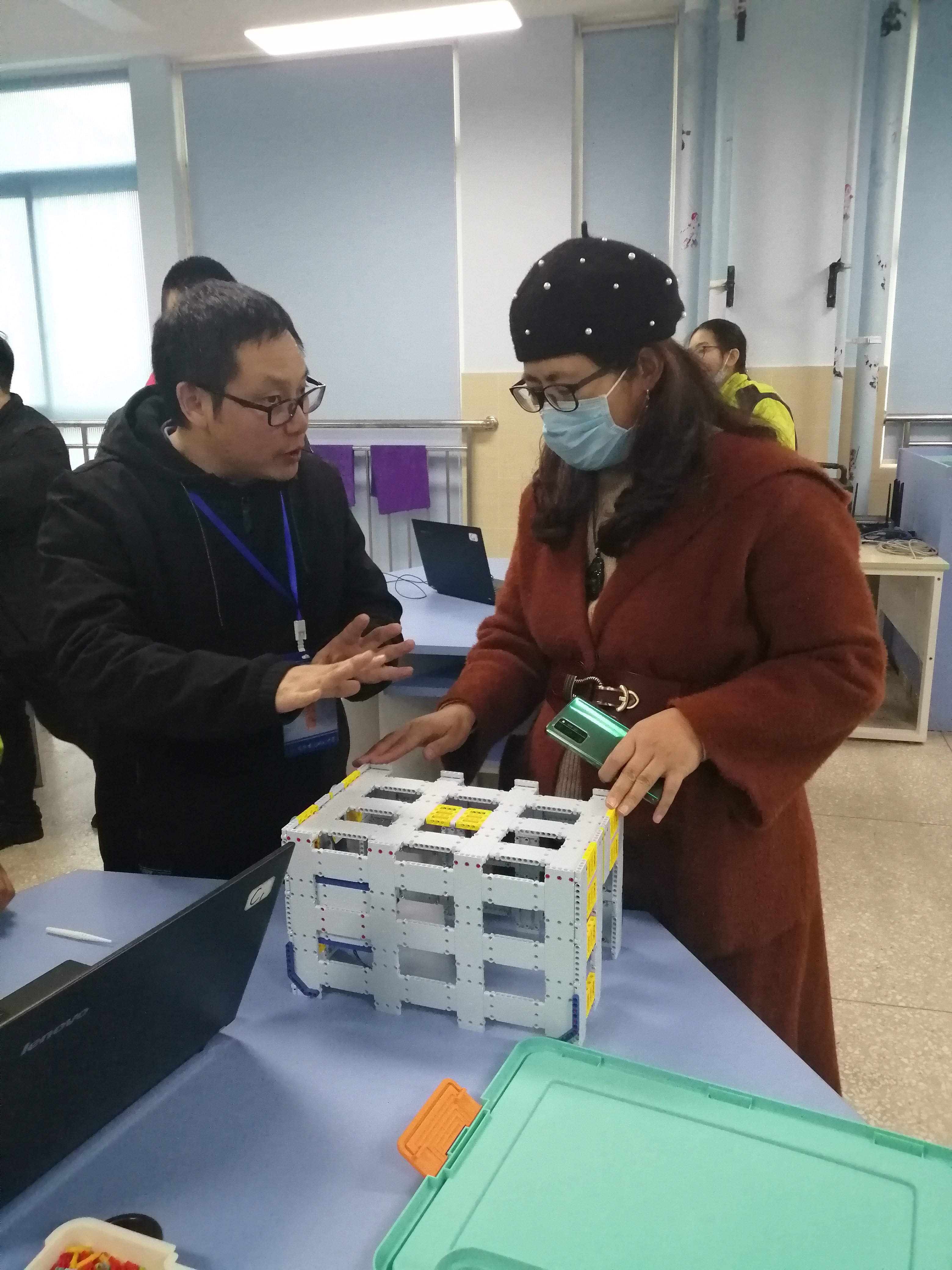 听课老师们纷纷离开坐位,来到同学们中间,观察同学的实践制作,同学们陶醉在课堂中,用心做自己的作品,给参加调研的老师们展示了一个真实的人工智能课堂。