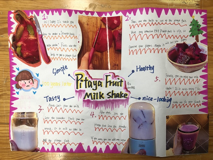 这是一次英语学习与劳动创作的完美结合。正如苏霍姆林斯基所说:“手使脑得到发展,使他更加明智;脑使手得到发展,使他变成创造的聪明的工具,变成思维的工具和镜子。”在完成作品的过程中,同学们既动脑也动手,不仅将英语课堂中所学的知识进行了应用,也亲身体验了制作美食的不易以及完成后的成就感。
