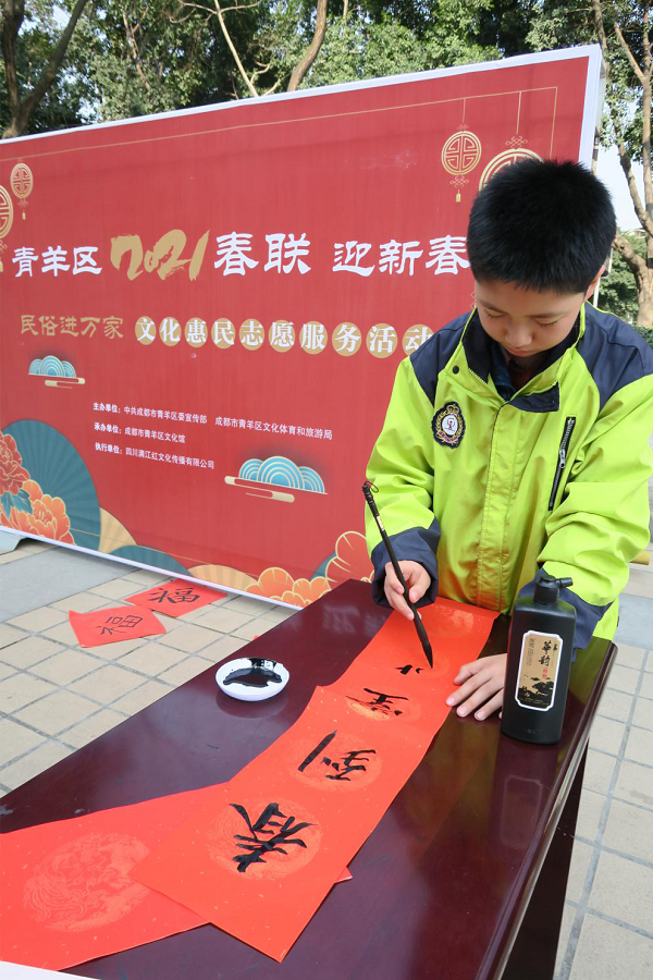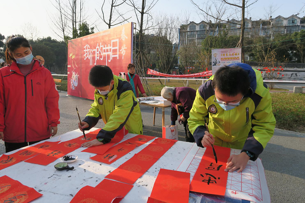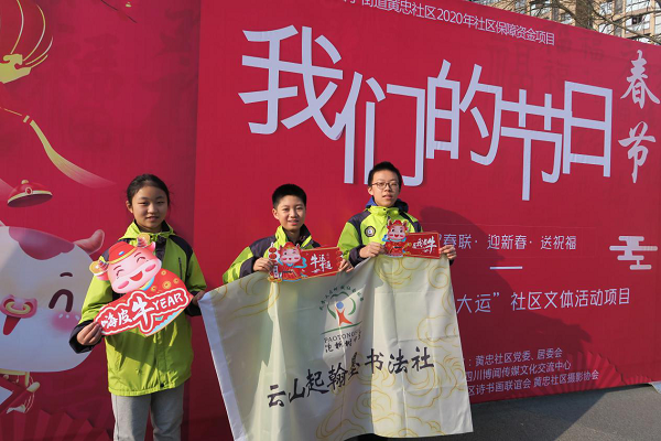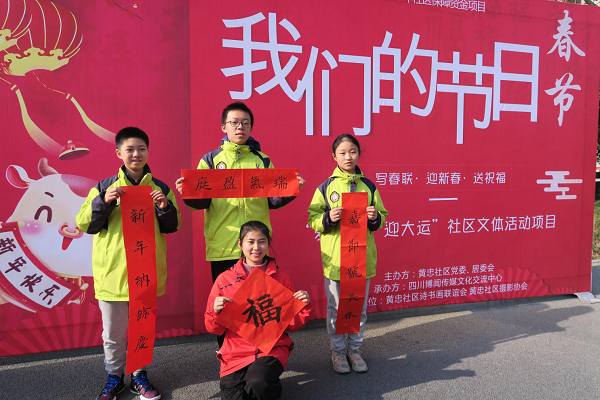 2021年2月5日,成都市泡桐树中学云山起翰墨书法社的同学们到黄忠社区参加“我们的节日写春联,迎新春,送祝福”社区文体活动。这次活动是由黄忠社区组织,通过邀请书法爱好者为社区居民书写春联,以迎接新春的到来。