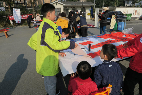 活动中,云山起翰墨书法社的同学们积极地为社区的居民们书写春联、福字,得到了大家的一致称赞。旁边围观的爷爷奶奶和社区工作人员连连夸赞同学们字写得好,一直站在旁边,等同学们的春联一写完就立即“抢走”,书法社成了妥妥的全场人气担当。看到自己写的春联和福字那么受欢迎,看到拿到春联后的爷爷奶奶乐呵呵的样子,看到阿姨笑得弯弯的眼睛,看到小朋友趴在桌旁羡慕的眼神,同学们心中也有说不出的快乐。